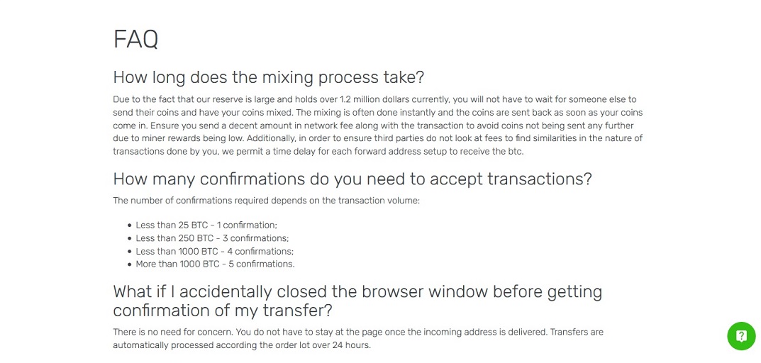 Процедура смешивания занимает до 6 часов. Учтите, что есть сервисы, предлагающие подождать 1-2 дня. Этот ресурс не требует регистрации. Все логи удаляются сразу после завершения микширования, неиспользованные заказы - через 5 дней. Шифрование данных присутствует. На момент написания ChipMixer является одним из лучших сервисов микширования BTC. Мы определенно рекомендуем это.