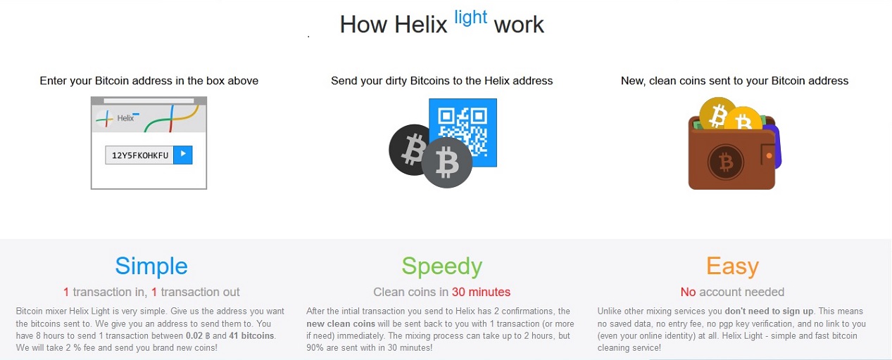 Адрес Helix Bitcoin mixer безупречная репутация - причина, по которой я выбрал Helix. Другие преимущества - это плата, контролируемая пользователем, вторая - дополнительные адреса, и третья - похвальная скорость обработки транзакций. Миксер прост и понятн, это один из самых чистых пользовательских интерфейсов, которые я когда-либо видел, он просторен, имеет все нужные кнопки в нужных местах и прост для понимания.